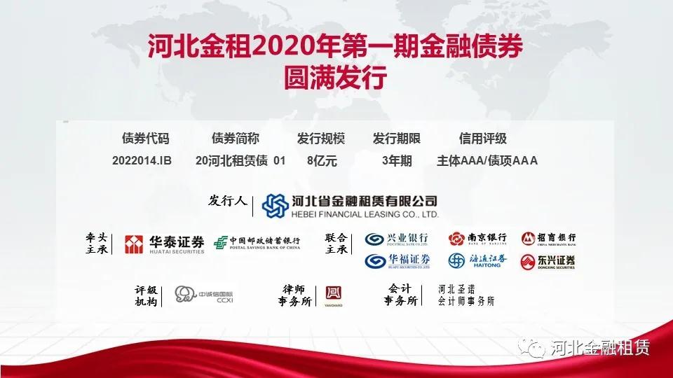 日前,河北省金融租賃有限公司(以下簡稱“河北金租”)2020年第一期金融債券成功發(fā)行,發(fā)行規(guī)模8億元,期限3年。此次河北金租發(fā)行的金融債券場內認購倍數(shù)達到2倍,投資人認可度較高,債券所募資金將主要用于清潔能源、節(jié)能環(huán)保、醫(yī)療健康等公司戰(zhàn)略行業(yè)項目投放,同時積極助力新冠肺炎防控,為防疫醫(yī)療設備商和服務商、新冠疫情定點醫(yī)療機構提供金融服務,支持湖北等地區(qū)公共事業(yè)及工程裝備制造等行業(yè)發(fā)展。