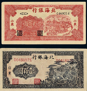 在抗戰(zhàn)勝利結(jié)束時,山東解放區(qū)已有極大發(fā)展,有12.5萬平方公里的面積,占山東總面積的92%,擁有2400萬人口,占山東總?cè)丝诘?0%。1948年10月,山東的北海銀行幣與華北的冀南銀行幣、晉察冀邊區(qū)幣固定比價互相流通,1948年11月16日起,北海銀行幣與華中銀行幣等價流通。這一時期的北海銀行幣均不加蓋地名,便于山東以外的地區(qū)流通。1948年12月1日,華北銀行、北海銀行、西北農(nóng)民銀行合并,在石家莊成立中國人民銀行,但因工作的需要,北海銀行繼續(xù)營業(yè),1949年1月底開始回收北海銀行幣,同年11月1日改稱中國人民銀行山東分行,至此,北海銀行完成了它的歷史使命宣告結(jié)束。