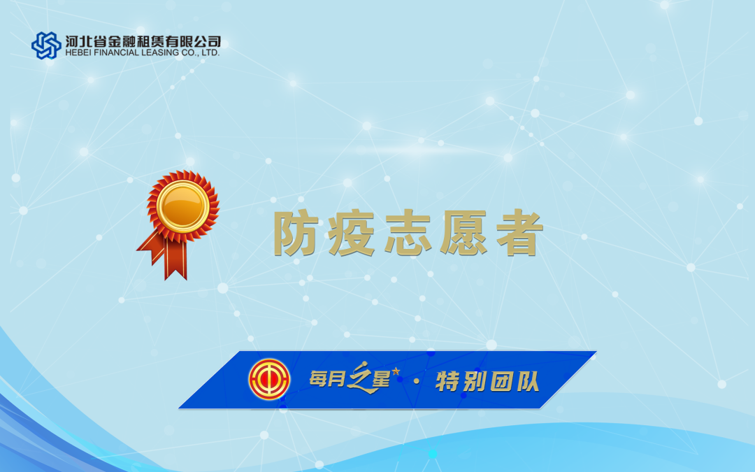 8月份,河北金租一方面抓業務促投放,積極創新業務模式和打磨服務產品,一方面積極落實區域防疫政策,以責任傳遞租賃溫度,為疫情防控貢獻力量。工會委員會評選出本月“每月之星”,請優勝團隊和優秀員工珍惜榮譽,再立新功,請全體干部員工以先進為榜樣,再接再厲,再創佳績