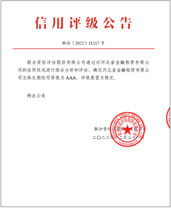 關注 | 河北金租斬獲“雙AAA”長期主體信用評級