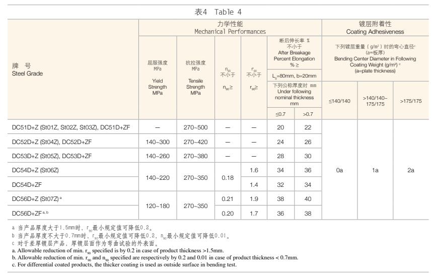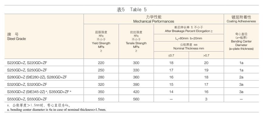 1. 鋼板及鋼帶的力學(xué)性能和鍍層附著性應(yīng)符合表4、表5、表6中的規(guī)定。