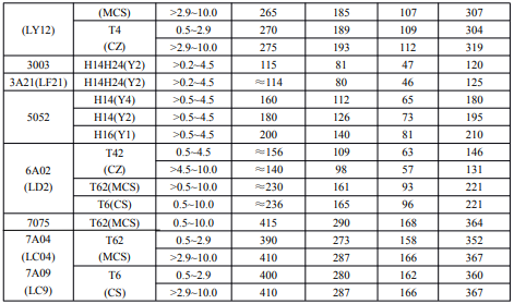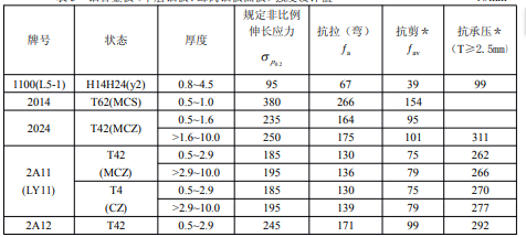 表5鋁合金板(單層鋁板、蜂窩鋁板面板)強(qiáng)度設(shè)計(jì)值